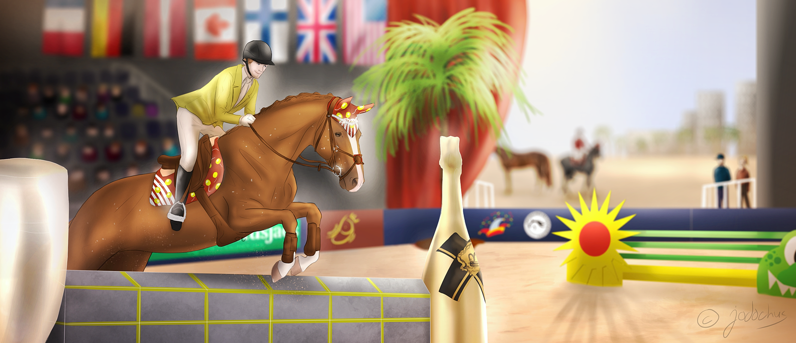 Karkkivärinen kevätkuva jossa on paljon katseltavaa. Tekstuurit toimii ja tarkkuudella on leikitelty hienosti. Ratsukon kumpaankin osapuoleen on panostettu yhtäläisesti. Taustan sateenkaari viimeistelee värikirjon.